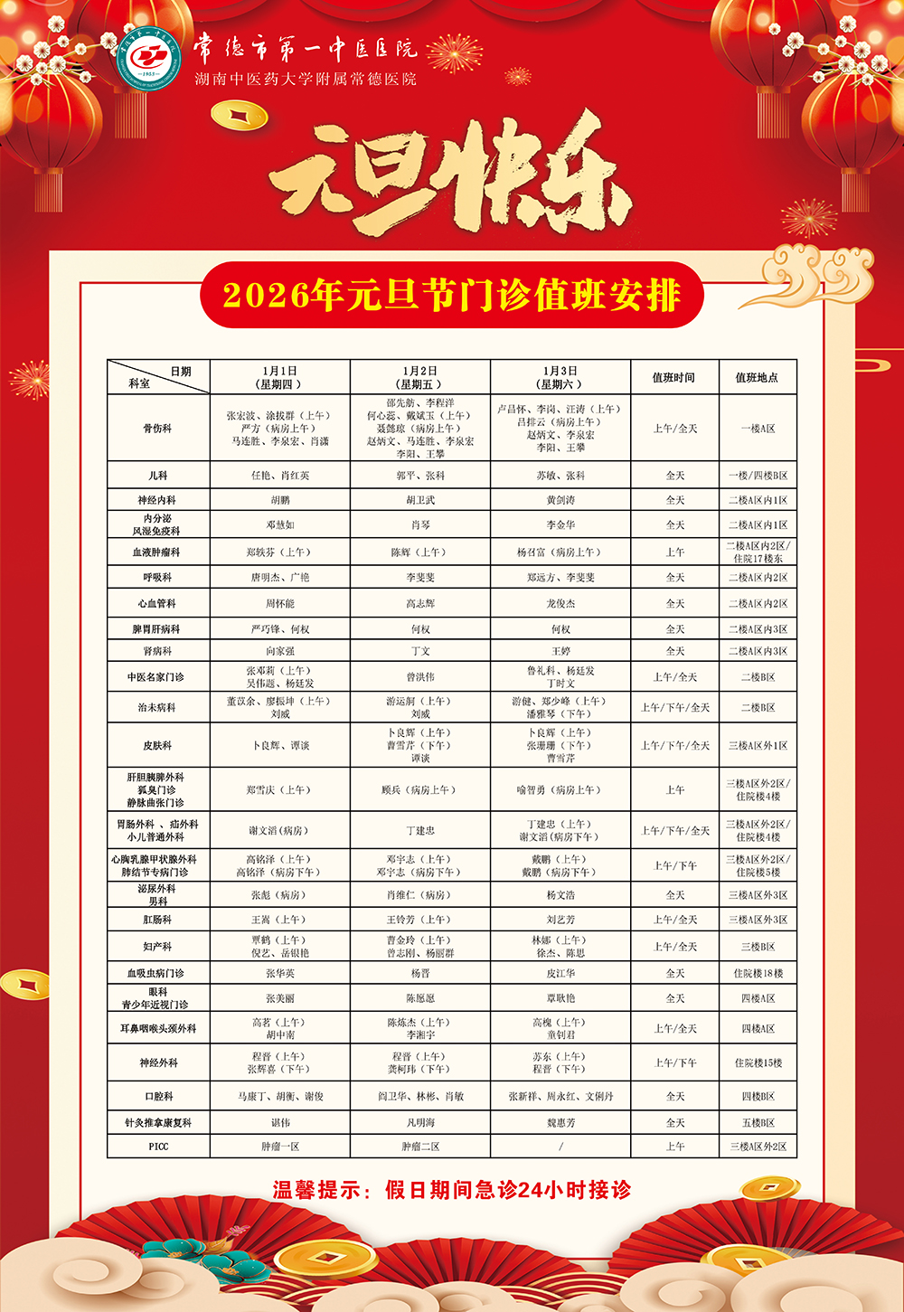 2026年元旦节期间我院放假三天,具体时间为2026年1月1日至1月3日。为方便广大患者就医,现将放假期间门诊值班安排情况公布如下: