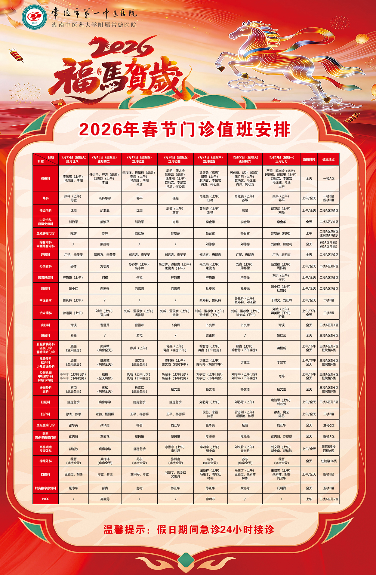 2026年春节期间我院放假九天,具体时间为2026年2月15日至2月23日。为方便广大患者就医,现将放假期间门诊值班安排情况公布如下: