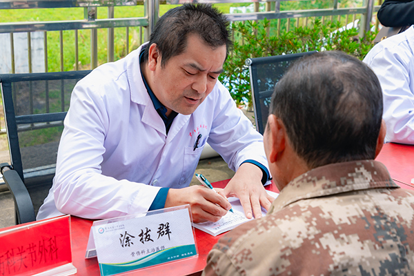 义诊现场人头攒动,前来就诊的群众络绎不绝,各科室专家各司其职,服务有序高效。62岁的覃伯伯是冠心病支架术后患者,因经济拮据一直未能复查,心中满是顾虑。医院心血管科二病区负责人、主任医师周怀能接待他后,细致询问病史、核查身体状况,不仅免费完成复诊,还针对性调整治疗方案,开具阿托品等药物,同时反复叮嘱用药剂量、低盐低脂饮食及规律作息的关键要点。常年居家的唐奶奶也在义诊中解了忧,受了益。近期她被手麻、抬手困难、下蹲不便等问题困扰,生活多有不便。骨伤科副主任医师张斌为其细致查体后,确诊为肩周炎合并腰椎间盘突出,随即为她进行复方巴布剂贴敷治疗,开具口服止痛药,还手把手教她简单易学的康复锻炼动作,耐心讲解日常养护注意事项。“专家看得细、说得明,贴了药、学了操,心里踏实多了!”唐奶奶感激地连连道谢,不停夸赞义诊服务贴心又实用。短短2小时内,常德市第一中医医院便为100余名村民提供免费诊疗,让居民在“家门口”就得到了名医的诊断和治疗。