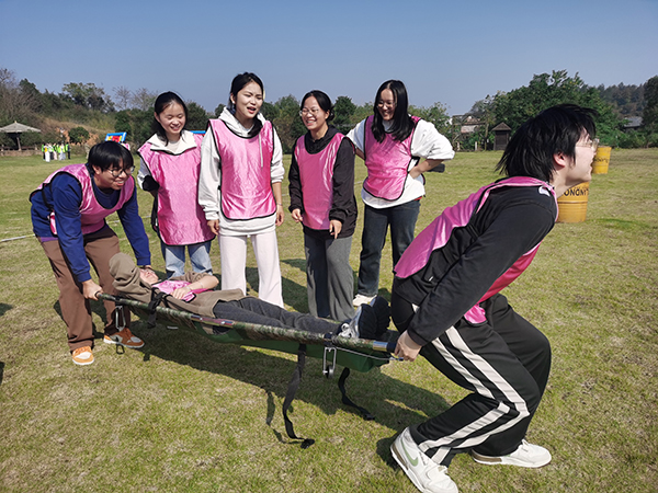 真人CS和战地救护等综合训练环节融合了智力、体力和应急能力训练。特别是战地救护环节,将医学专业知识与实战演练相结合,强化了学生的应急处置能力。各小组在活动中互相学习、取长补短,展现出良好的专业素养和团队精神。