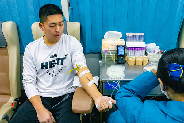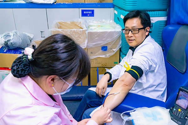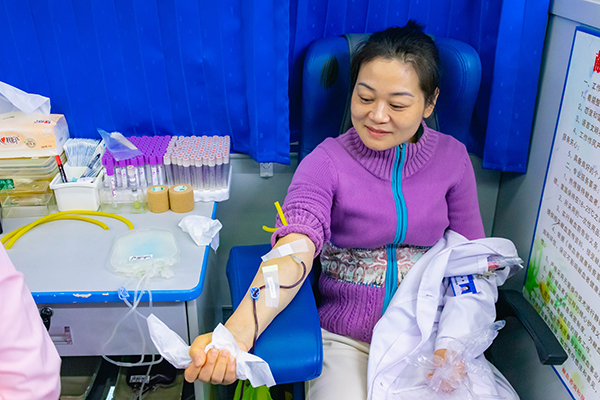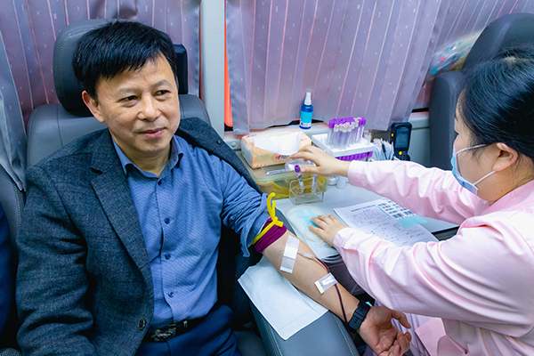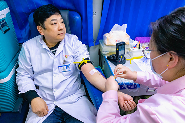 活动当天上午8时,科教楼前坪的献血点已布置就绪,采血设备、急救用品等一应俱全。现场暖意融融、秩序井然,来自全院各科室的医务工作者、行政后勤人员、实习生、规培生,以及部分职工家属、热心群众,在工作人员和志愿者的引导下,有序完成信息登记、血液初筛、血压测量等流程,确认符合献血条件后,依次登上采血车挽袖献血。一袋袋鲜红的血液,承载着医者的责任与群众的爱心,凝聚着守护生命的力量,彰显着无私奉献的担当。院党委高度重视此次活动,党委书记屈贵顺、院长李振龙来到现场,亲切慰问每一位献血者,详细询问献血流程、血液检测及后勤保障等情况,对大家的无私奉献精神致以崇高敬意。党委委员、副院长陈伟率先垂范,主动参与献血,以实际行动作出表率;“献血达人”王腊忠、输血科谭凤、科教部刘艳琼、药剂科史彩菊等老职工再次加入献血队伍,续写爱心接力;刘经明与刘雅玲、曾淼与龚璇璇等夫妻档、职工家属携手参与,用默契传递温情。“作为医务工作者,我们更清楚血液对临床救治的重要性,能以无偿献血为生命续航,是责任也是荣幸。”一位献血职工说道。